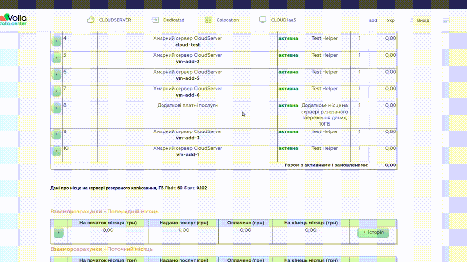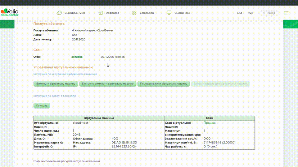 Основні функції управління послугою CLOUDSERVER реалізовано в Особистому кабінеті абонента:
