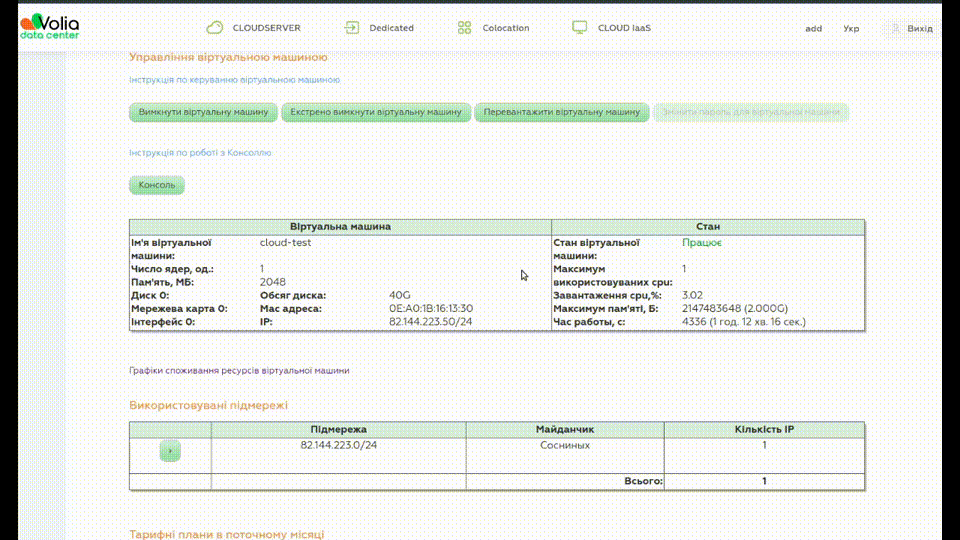 2. В таблиці Послуги абонента ви бачите список ваших хмарних серверів та тарифних планів з вказаними назвами віртуальних машин.